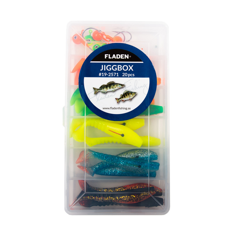 Laatikko, jossa on Shadeja kuumissa väreissä yhdessä pyöreiden jigipäiden kanssa – Valmis kalastamaan!
