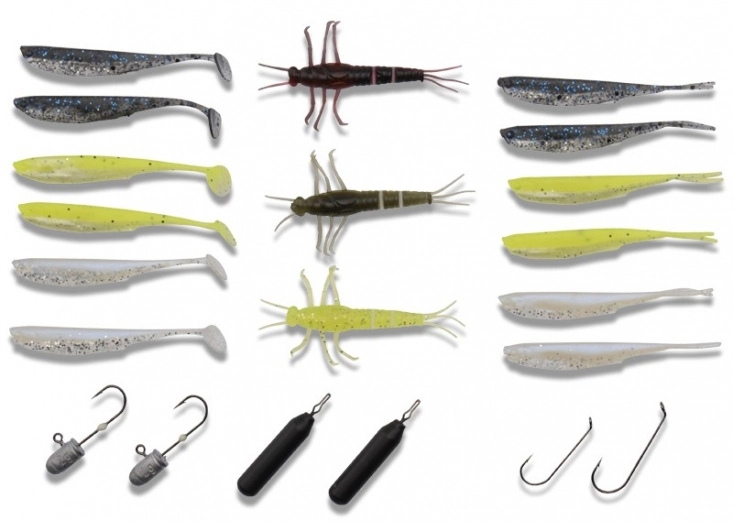 • 3 x 3D PVC Mayfly (5cm)• 6 x 3D Fry Paddle tail (5cm)• 6 x 3D Fry V tail (5cm)• 2 x SG Micro Dart Jighead (#8 – 2g)• 2 x Dropshot koukku vakio S (#8)• 2 x Drop Shot painosylinteri S (5g)